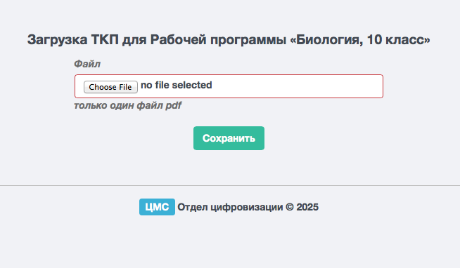 Загрузить можно только один раз, только один файл .pdf. После загрузки вернётесь на страницу с Рабочей программой, где прикреплённый файл будет доступен для просмотра и скачивания.
